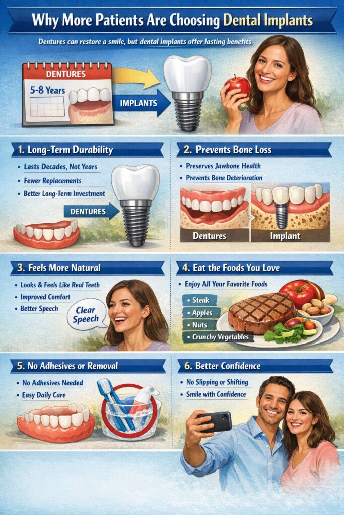 Dentures can restore a smile, but they often come with daily challenges. Dental implants address many of those issues and offer several long-term advantages.